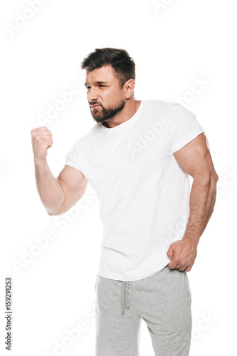 competition, people, portrait, caucasian, man, racked, brunet, casual attire, fist, athlete, t-shirt, photogenic, posing, standing, battle, anger, gesture, gesticulate, athletic, muscular, wrath, bearded, isolated on white, one person, front view, young adult, casual clothes