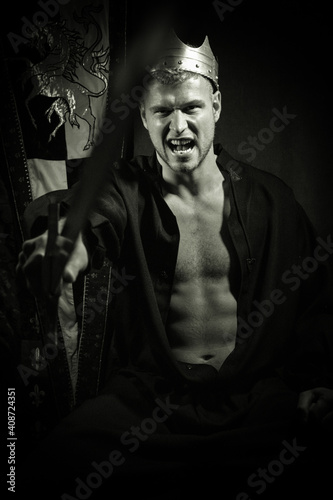 Portrait of handsome king with beard dressed in costume, holding sword and looking at camera
