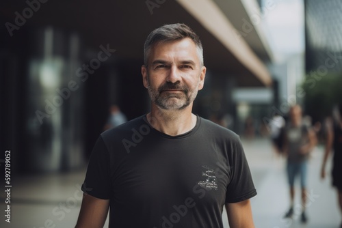 Portrait of handsome middle-aged man with beard in black t-shirt