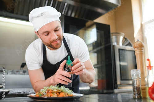Portrait of handsome positive chef cook at the restaurant kitchen