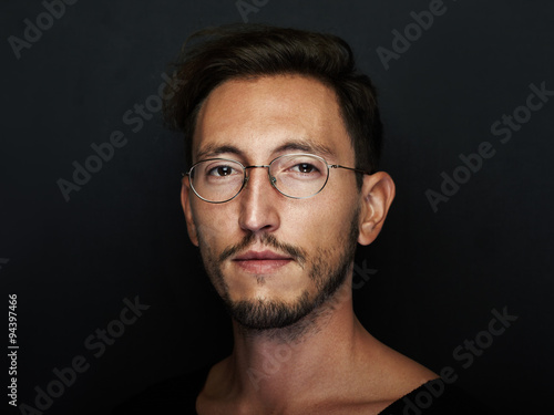 guy, casual attire, portrait, beard, young, look, hair, man, coiffure, fashionable, macho, serious, t-shirt, mock, up, blank, background, horizontal, goggles