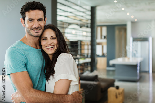 Portrait of happy couple hugging at home