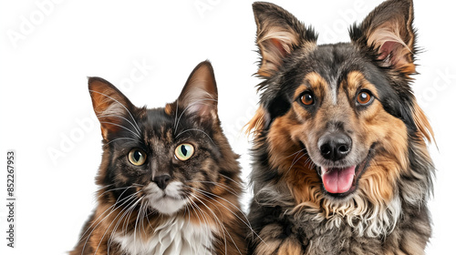 Portrait of Happy dog and cat that looking at the camera together isolated on transparent background, friendship between dog and cat, amazing friendliness of the pets