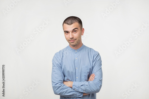 Portrait of happy fashionable handsome man in blue shirt crossing hands and look at camera.