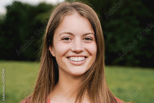 Portrait of happy girl smiling at camera outdoor with park on background - Focus on face