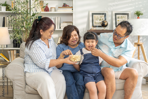 Portrait of happy love family asian father and mother playing with adorable asian kid girl.daughter, care, insurance.Happy family moments good time love with grandparents.Love of big family