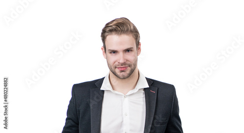 Portrait of happy professional man employee in formal business wear isolated on white, broker