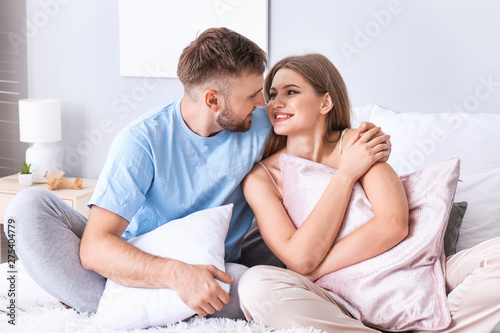 Portrait of happy young couple in bedroom