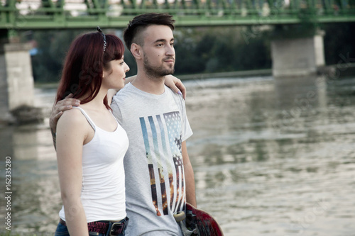 adult, affectionate, beard, bonding, boyfriend, carefree, casual clothes, color image, couple, croatia, day, friendship, girlfriend, happiness, horizontal, individuality, lifestyle, love, man, outdoors, people, photo, portrait, real people, redhead, river, romance, sleeveless, togetherness, two people, waist up, woman