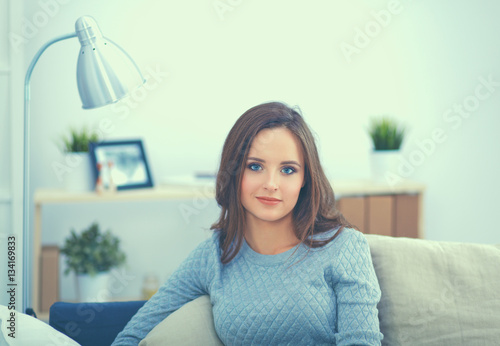 Portrait of happy young woman sitting on sofa