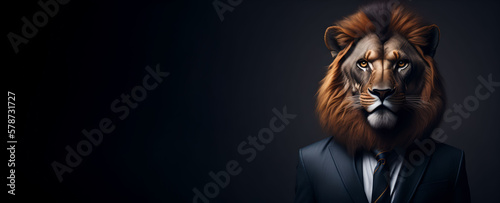Portrait of Humanoid Anthropomorphic Lion Wearing Businessman Boss Suit in Black Background for Copy Space Banner Generative AI