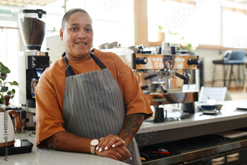 Portrait of joyful young adult African American woman wearing apron standing at cafe counter against coffee machines looking at camera