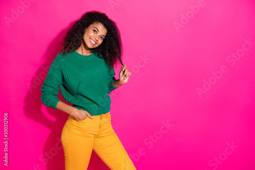 Portrait of lovely positive cheerful dark skin girl touch her skin have fun on winter holidays wear green knitted pullover yellow style pants isolated over bright color background