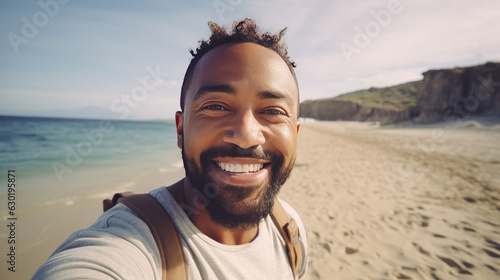 Portrait of male tourist taking selfie and walking on the beach. AI Generated.