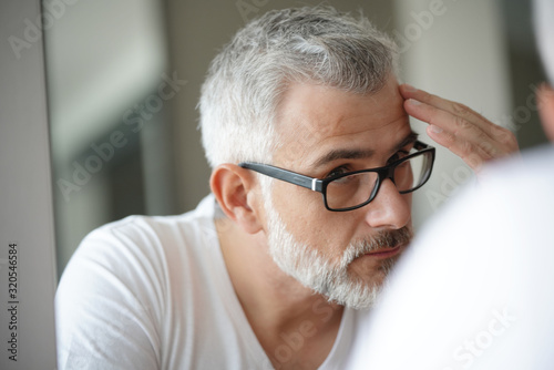 man, hair, hair care, alopecia, alopecia, cosmetic, concern, eyeglass, mature, middle-aged, 40s, grey hair, portrait, closeup, beauty, hygiene, one person