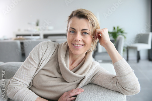 woman, portrait, mature, middle-aged, middle-aged, beautiful, attractive, blue eye, sitting, relaxing, sofa, couch, home, single, one person, smile, smiling, happy, blond, blond, indoor, modern, contemporary, relaxed, caucasian, european