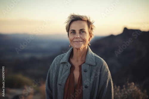 Portrait of mature woman looking at camera while standing in mountains during sunset