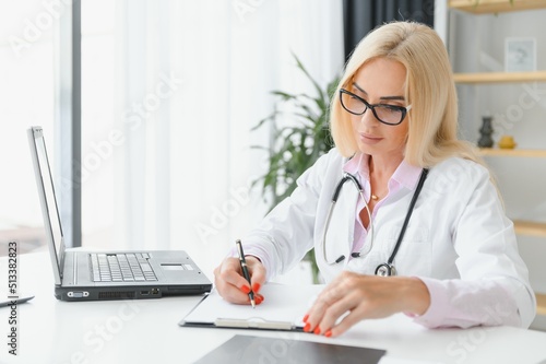 Portrait of middle age female doctor is wearing a white doctor's coat with a stethoscope around her neck. Smiling physician standing at private clinic