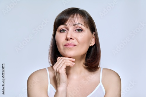 Portrait of middle aged woman looking at camera on light studio background