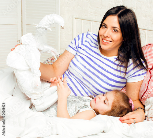 Portrait of mother and daughter laying in bed and smiling close up, lifestyle family people concept