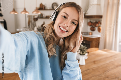 Portrait of pleased blond girl 20s wearing headphones smiling and taking selfie photo at home