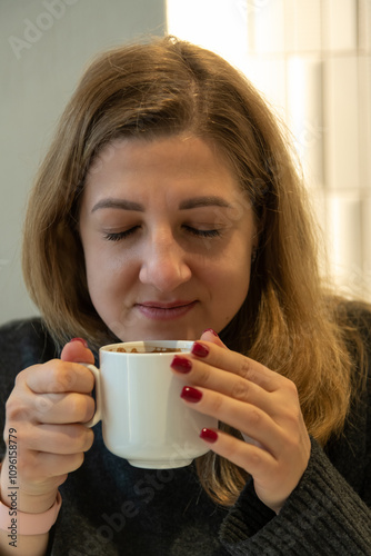 person, woman, hot drink, cafes, drink, cup, portrait, hand, holding, hot drink, lifestyle, drip, female, caucasian, brewed, adult, manicure, breakfast, home, filtered, pretty, mug, porcelain, cappuccino, enjoying, metabolism, crema, aroma, caffeine, black coffee, espresso, sweater, arabica, soluble, brown, mouth, beverage, white, face, instant, fingernail, copy space, morning, red, break, business, eatery
