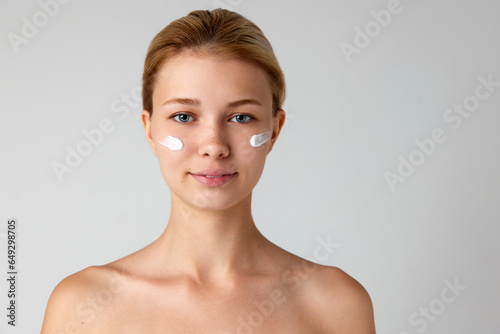 Portrait of pretty young girl with spotless, well-kept skin with face cream isolated over grey studio background