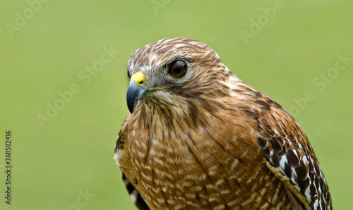 Portrait of Red-shouldered Hawk (Buteo lineatus), against natural green background. Copy space.