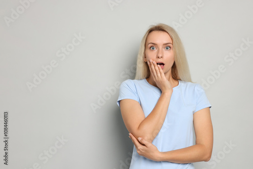 Portrait of scared woman on gray background, space for text