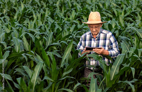 Portrait of senior farmer standing in corn field with tablet in his hands and examining crop.