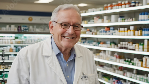 Portrait of senior male pharmacist standing in pharmacy and smiling