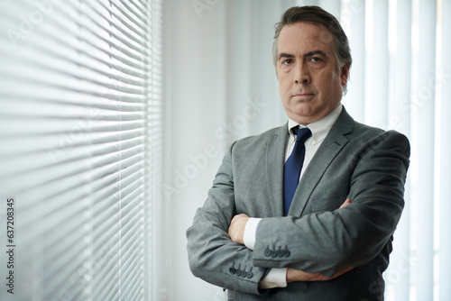 Portrait of serious confident businessman standing at office window with arms crossed