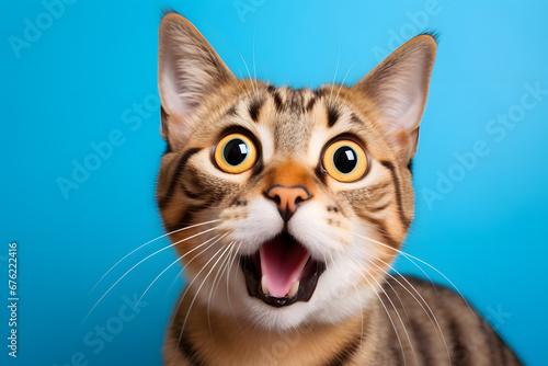 Portrait of shocked cat with open mouth and big eyes in front of blue background