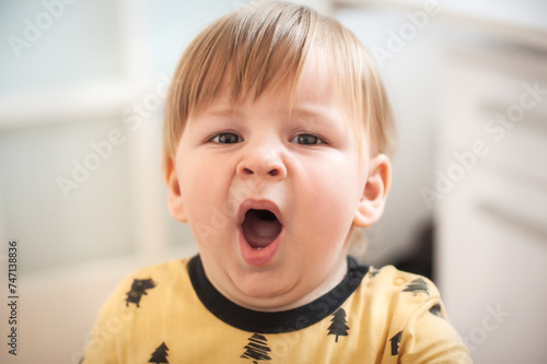 Portrait of sleeping beautiful and yawning baby toddler waiting time for bed. Happy carefree childhood