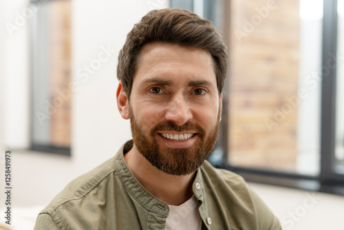 man, portrait, smiling, businessman, entrepreneur, home, office, remote, work, freelancer, working, from, modern, dental, teeth, health care, lifestyle, happy, beard, facial, hair, casual attire, shirt, bearded, photogenic, hispanic, communication, connection, cyberspace, online, business, career, success, successful, confident, achievement, confidence, positive, optimistic, friendly, people, professional, indoor, house, apartment, interior, background