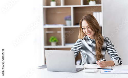 Portrait of smiling beautiful business asian woman working in office use computer with copy space. Business owner people sme freelance online marketing e-commerce telemarketing, work from home concept