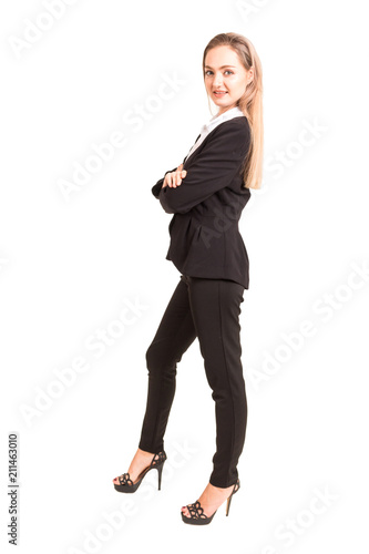 Portrait of smiling businesswoman in black suit standing isolated on white background