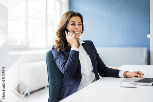 Portrait of smiling businesswoman on the phone sitting at desk in an office