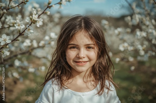 portrait of smiling girl with long hair standing amidst blooming cherry blossom trees on a sunny day in springtime outdoors