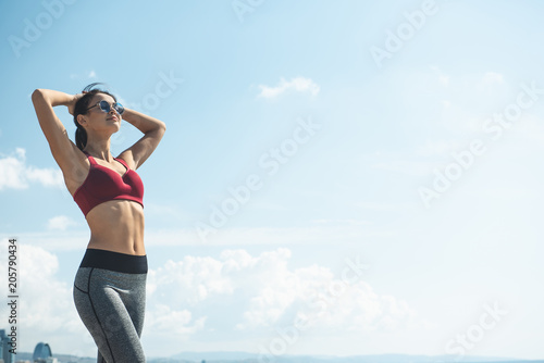 Portrait of smiling lady resting against blue sky after working out. Happy girl practicing gymnastic exercise concept