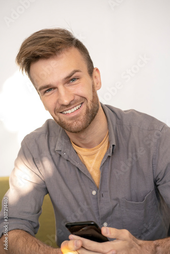 businessman, shirt, mobile phone, holding, smiling, sitting, relaxed, joy, content, grey, light, online, fun, connection, lounge, sunlight, beam of light, sunbeam, front view, indoor, portrait, shadow, day, office, positive, technology, casual attire, accessibility, break, confidence, wireless, resting, wi-fi, freelancer, lens flare, smartphone, recovering, one person, caucasian, blond, beard, business, businessperson, communication, phone, relaxation