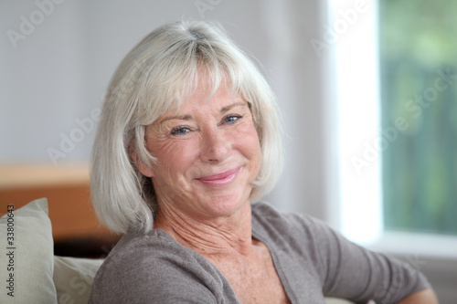 portrait, senior, old woman, retired, elderly, sitting, sofa, couch, home, smiling, indoor, relaxed, relaxation, joyful, blond, white hair, caucasian, 60