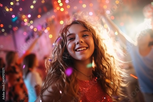Portrait of smiling young girl dancing with confetti at party in nightclub