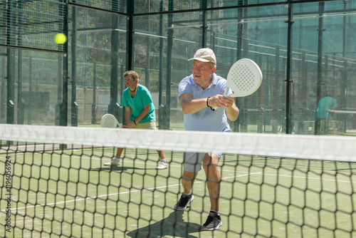 man, player, tennis, paddle, ball, racquet, playing, receiving, stroke, sport, match, competition, sporting, training, team, opposing, interaction, people, equipment, activewear, outdoors, court, summer, scenery, portrait, elderly, senior, adult, 60s, swede, american, appearance, real, emotion, expression, concentration, focused, resolved, dynamic, energy, hobby, activity