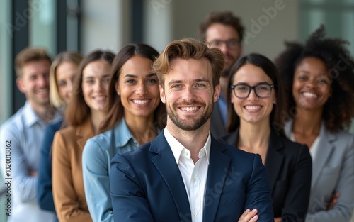 Portrait of standing in row smiling diverse team looking at camera. Happy multiethnic corporate staff, young specialists, company representatives, bank workers photo shoot, HR agency recruitments.