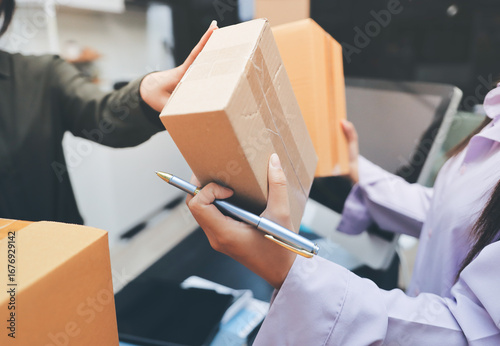 Portrait of Starting small businesses SME owners, two Asian woman check online orders Selling products working with boxs freelance work at home office, sme business online small medium enterprise