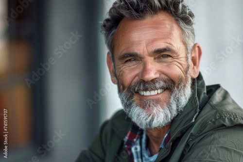 Portrait of Successful Middle Aged Bearded Man Looking at Camera and Smiling. Handsome Senior Businessman Wearing Jacket, Having Fun.
