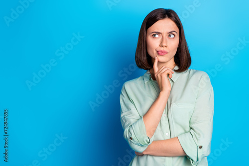 Portrait of suspicious girl with stylish hairdo wear turquoise blouse thoughtfully look empty space isolated on blue color background