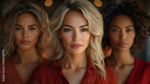 smiling, beauty, digital, blond, woman, graphic, studio, photo, group, portrait, eye, indoor, background, closeup, clothing, strong, light, natural, face, image, design, friends, photo, female, picture, art, three, happy, fashion, red, hair, realistic, brunette, diverse, confident, dress