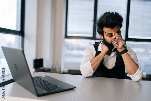 man, business, laptop, table, sleepy, pain, eye, dry, portrait, goggles, indian, eyeglass, computer, office, work, problem, stress, person, desk, young, job, sitting, ache, cephalalgia, health, adult, unhappy, overworked, workplace, exhausted, professional, businessman, male, indoor, manager, freelancer, massage, eyesight, frustrated, sad, online, upset, tiredness, depression, window, boss, career, education, crisis